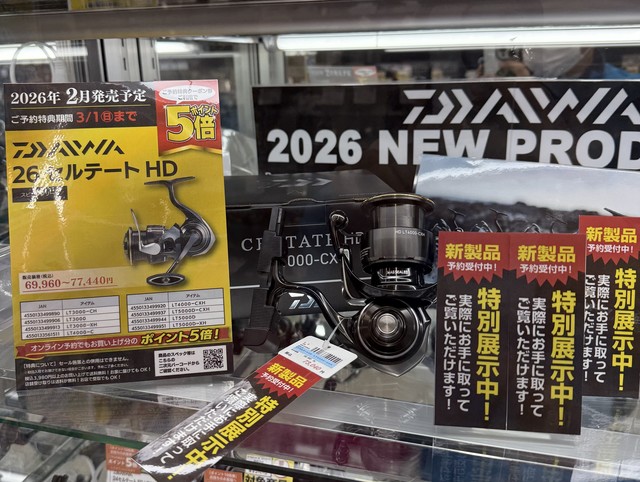 ダイワから新製品をお借りして店頭で特別展示中です♪