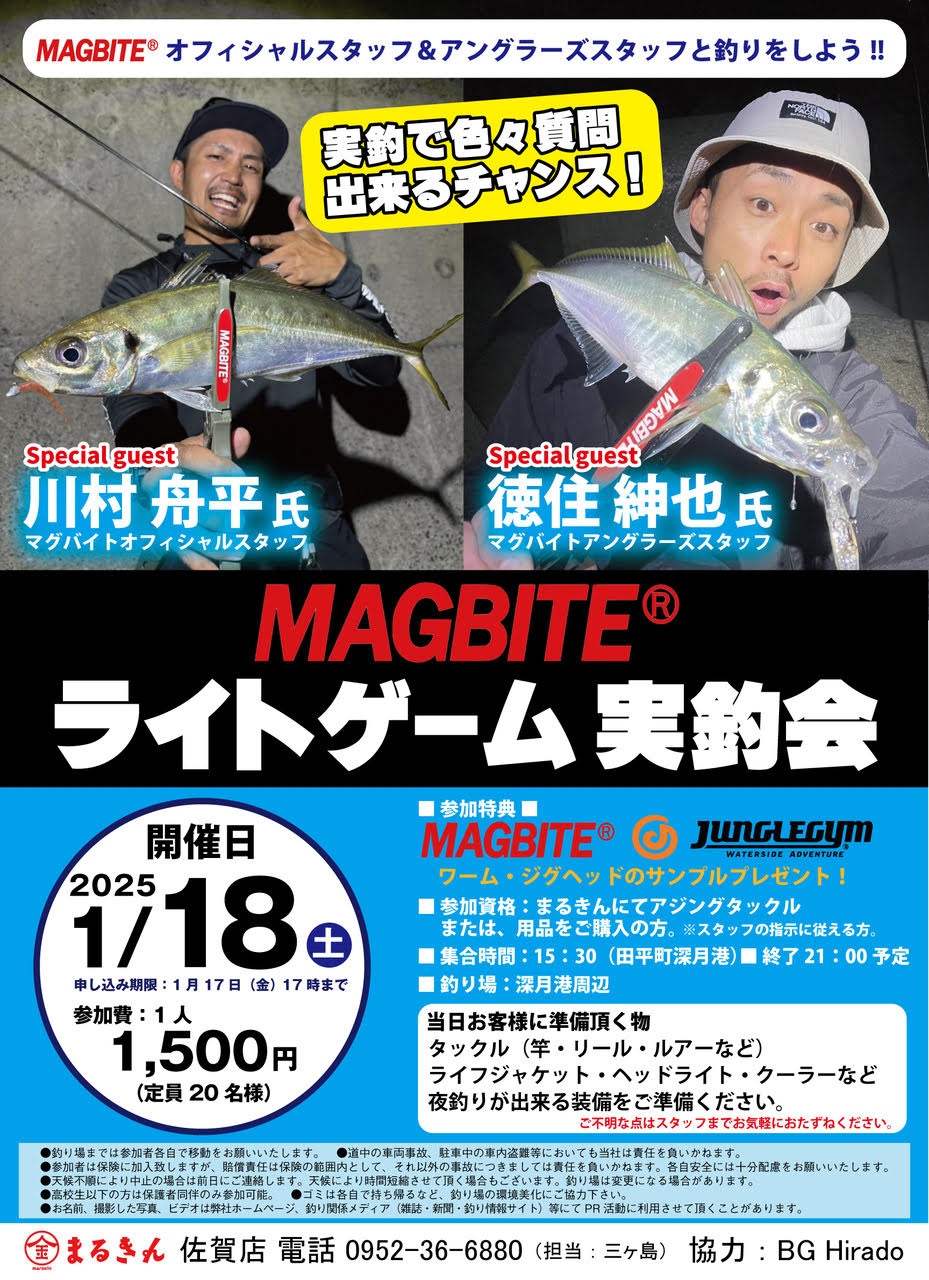 早くも年明けのイベントのお知らせ冬が面白いライトゲームアジング、メバリングなど色々楽しめます。今回はマグバイトの協力で実釣会を開催します日時 1/18㈯ 15:30集合 21時解散を予定。参加費はお一人様 1500円(保険代含む)場所は田平 深月周辺を予定。BG平戸の村田船長に協力いただきます。マグバイトからは 徳往さん川村さんが来てくださいます。実釣交えて色々聞いて使ってみるチャンスですのでこの機会にご参加ください。申し込みは佐賀店までよろしくお願いします。