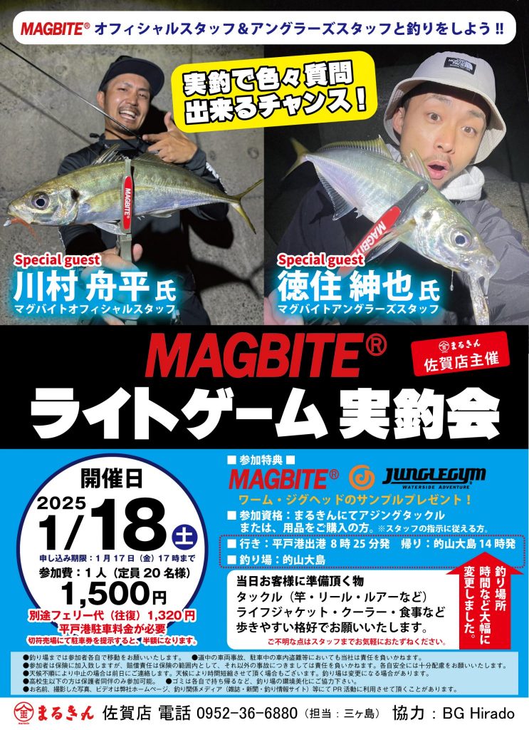 まるきん佐賀店です。18日(土)開催のマグバイトライトゲーム実釣会の開催場所、時間の変更のお知らせ。場所を的山大島に時間はデイゲームで的山行フェリー 8時25分発平戸行フェリー 14時発で行います。集合を平戸港8時的山到着後 9時半よりイベント開始13時半終了予定となります。まだ募集に空きがございますのでお気軽にお尋ねください。
