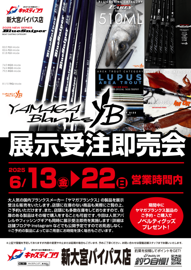 大人気の国内ブランクスメーカー「ヤマガブランクス」の製品を展示受注&販売をいたします。また、店頭にも多数在庫をしておりますので、在庫のある製品はその場で購入をすることも可能です。今回は人気アパレルやフィッシングギアも同時に展示受注即売を実施します!